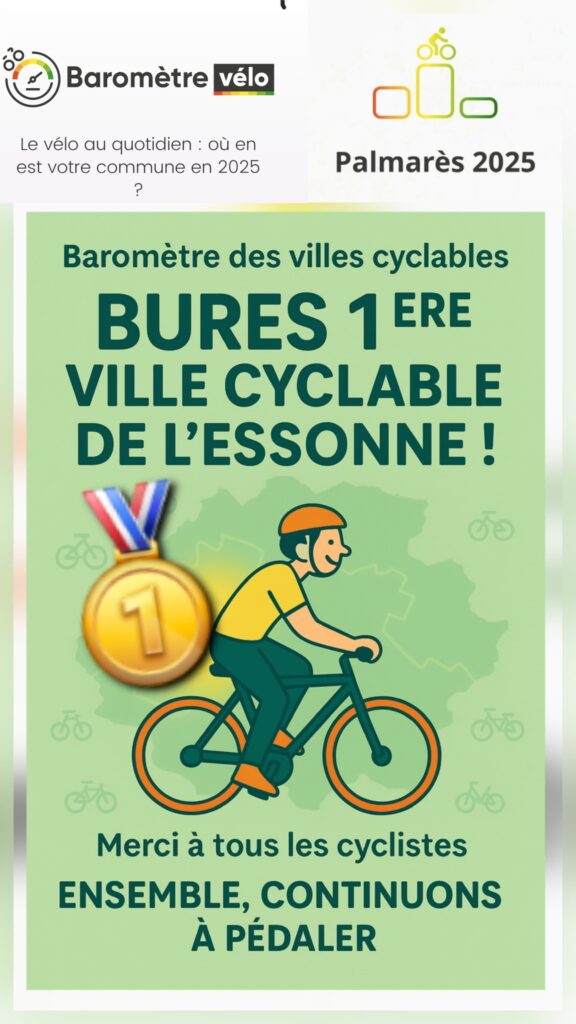 Bures obtient la 1ère place des villes cyclables de l’Essonne ex aequo avec la vile d’Angerville et se classe 5e en Île-de-France selon la Fédération des Usagers de la Bicyclette.