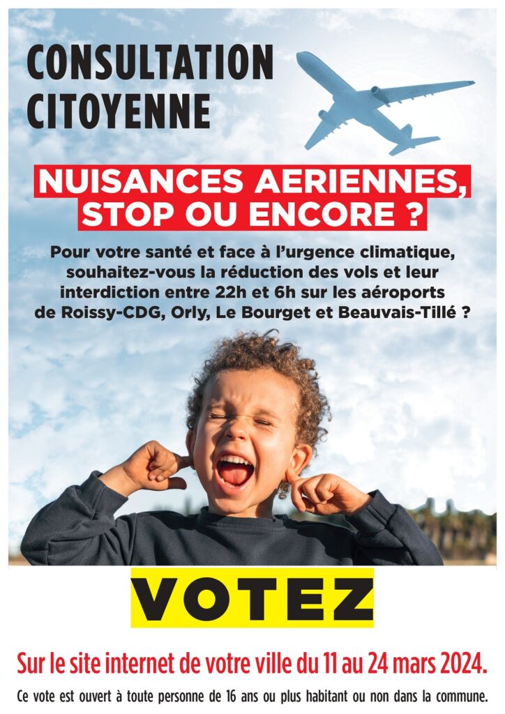 Jusqu’au 24 mars 2024, donnez votre avis et répondez à la question : Pour votre santé et face à l’urgence climatique, souhaitez-vous la réduction des vols et leur interdiction la nuit entre 22 heures et 6 heures sur les aéroports de Paris-Charles-de-Gaulle, Paris-Orly, Paris-Le Bourget et Beauvais-Tillé ?