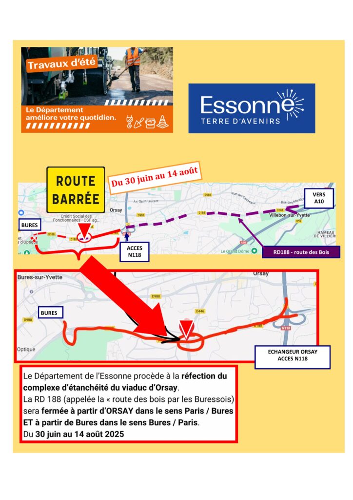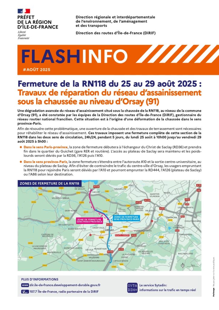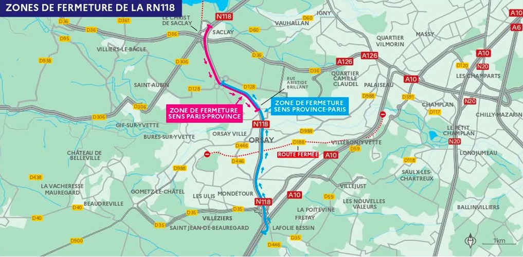 La RN118 sera fermée à Orsay dans les 2 sens pour travaux du 25/08 (10h) au 29/08 (5h)